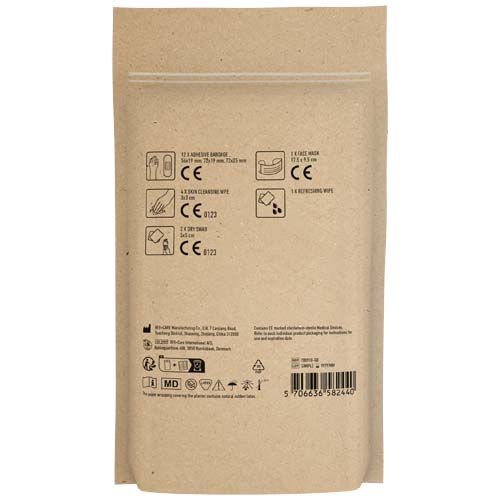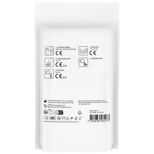 Este kit debería guardarse en todas las oficinas para poder afrontar pequeños accidentes o lesiones. Contenido: 12 apósitos resistentes al lavado, 2 bastoncillos secos, 1 mascarilla, 1 toallita refrescante y 4 bastoncillos para limpiar la piel. Todos los productos de primeros auxilios y cuidado del kit cumplen con las normativas vigentes en la UE. El precio incluye impresión a todo color. Se entrega en una funda de papel. Materials : Papel certificado FSC Certificates :BSCI Default print option : Impresión digital - frontal - max color : full colour - 100 x 120 mm Para este producto, el proveedor ha completado todo o parte de los datos GPSR. Para obtener más información, póngase en contacto con el proveedor.